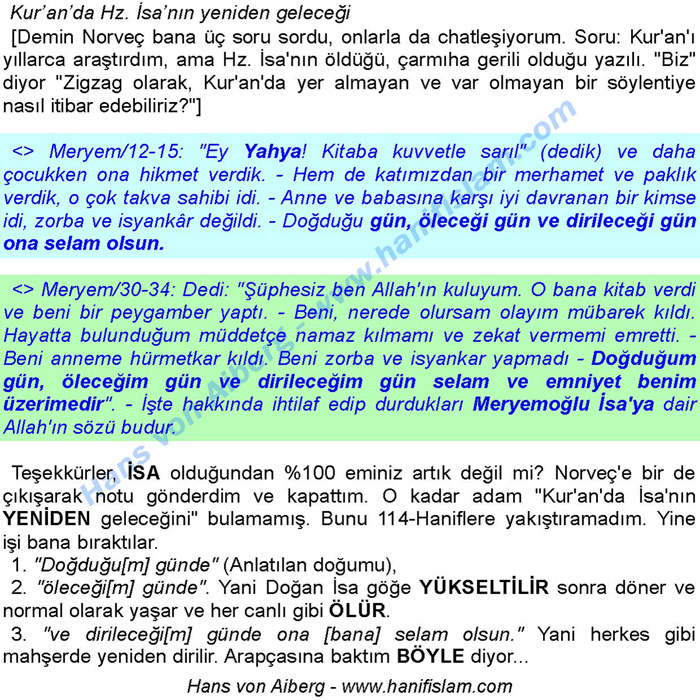 Evet Norveç’e bir de çıkışarak notu gönderdim ve kapattım. O kadar adam “Kur’an’da İsa’nın YENİDEN geleceğini” bulamamış. Bunu 114-Haniflere yakıştıramadım. Yine işi bana bıraktılar.