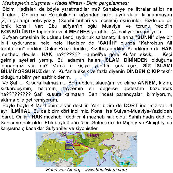 Böyle böyle 4 Mezhebimiz var dostlar. Yani bizim de DÖRT incilimiz var. 4 ayrı İLMİHAL. Bu da bizim dört incilimiz. Konsil ise Süfyan-Muaviye-Yezid’den ibaret. Onlar “HAK mezhebi” dediler 4 mezheb hak oldu. Sahih hadis dediler, Sahici ve hak oldu. Ehli beyti öldürdüler. Gelecekte de Mighty ve Almighty’nin karşısına çıkacaklar Süfyaniler ve siyonistler.