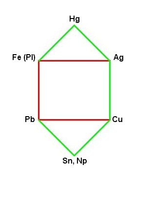 Arş’ın dört direği ve üç yatay katmanının hologramı... Dört direk bir kutu yapıyor. Cu, Pb, Fe, Au, Ag direkleri dik ama en altta Zigzag Arş’ında, Hg ve Sn direkleri dikey değil yatay ve kare prizmadan kopuk görünüyor. Sanki bir sandık ve aşağıda kapağı var.